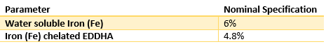 Characteristic: An iron deficiency corrector for plants. This product is completely water soluble and can be applied on any kind of soil. Its high content of chelated iron makes it useful to be used in alkaline and calcareous soils, where the use of iron chelates is essential for the plant development.